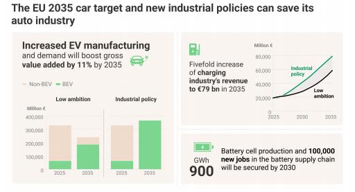 总之,“禁燃令”半途而废,沉没成本巨大,还可能导致大规模失业。T & E数据显示,若欧盟保持2035年“禁燃”目标,并实施推动新兴产业链发展的一揽子政策,到2035年,汽车产业对欧洲经济的贡献将增长11%。