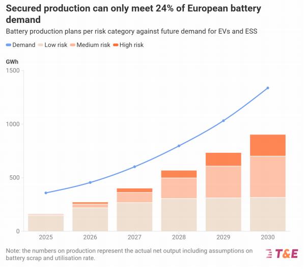 T&E分析,按实际预期产出,欧洲本土产能2030年或可满足本土三分之二的电池需求。若只有低风险项目落地,自给率将降至24%,远低于欧盟2030年40%自给率目标;计入中等风险项目,自给率可达52%,但低于T&E和欧盟先前预估。受不利因素影响,很多电池项目有取消或延迟风险。