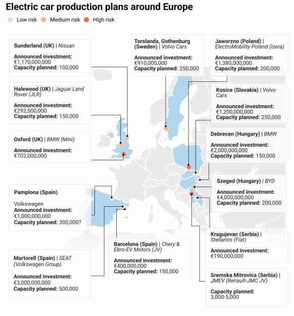 低风险项目包括宝马匈牙利工厂、沃尔沃斯洛伐克工厂等全新工厂,以及斯特兰蒂斯的塞尔维亚工厂、大众及奇瑞的西班牙工厂等改造工厂。这些项目合计年产能55万辆,带动约48亿欧元投资,创造至少5550个就业岗位。