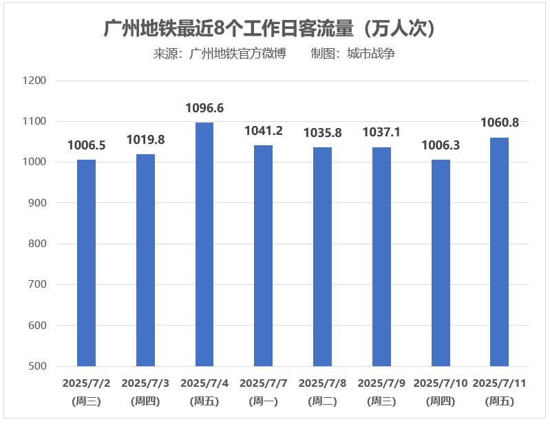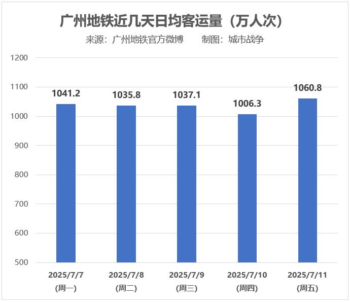 据广州地铁官方数据,上周一至周五(7月7日至11日)连续5个工作日,广州地铁每日客流量均超千万人次,首次实现“五连千”。