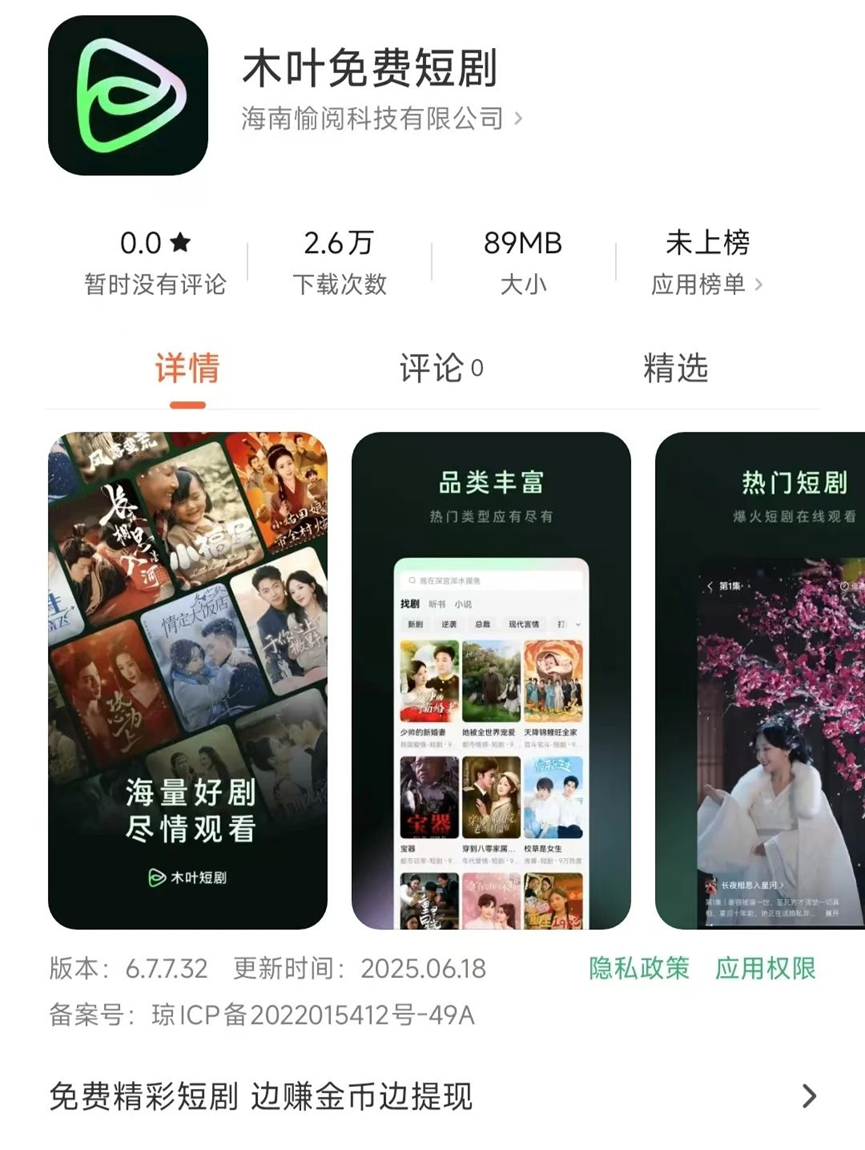 此外,淘宝、抖音等平台也在筹备短剧,字节跳动还上线了“木叶免费短剧”APP。
