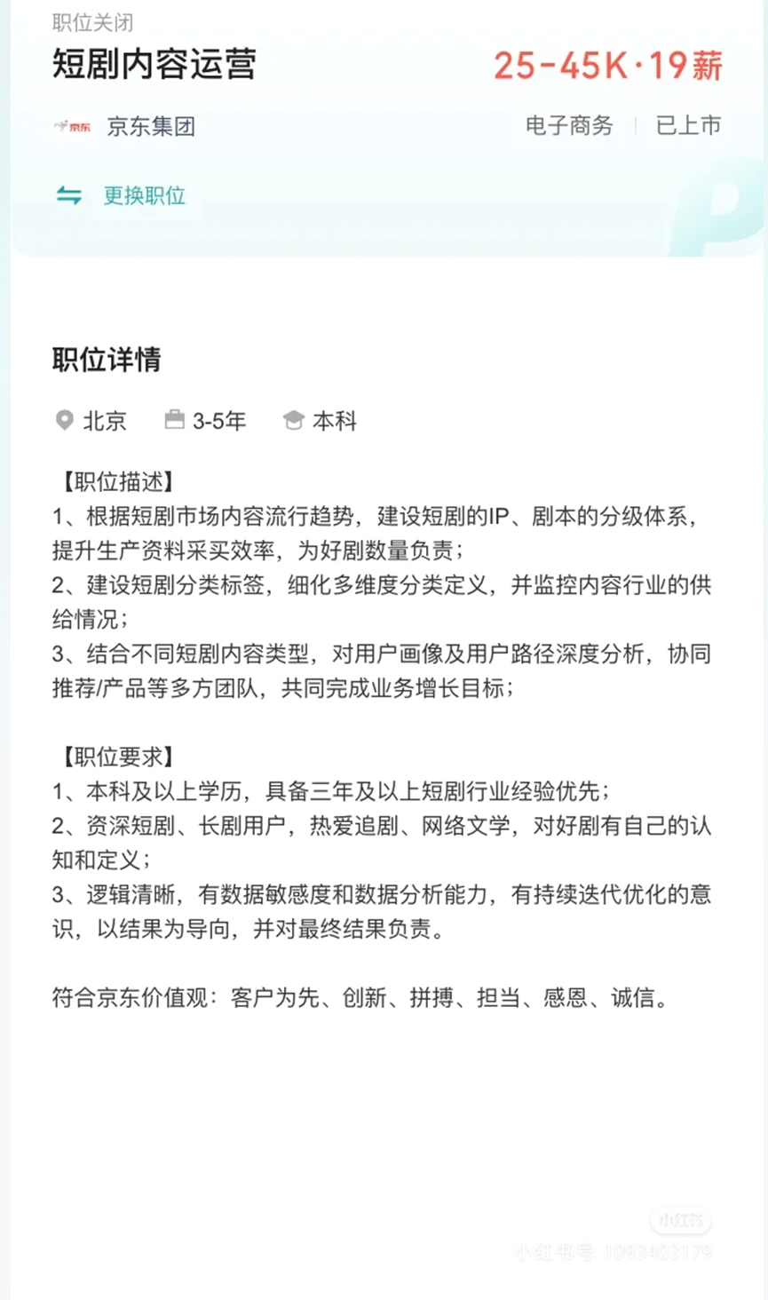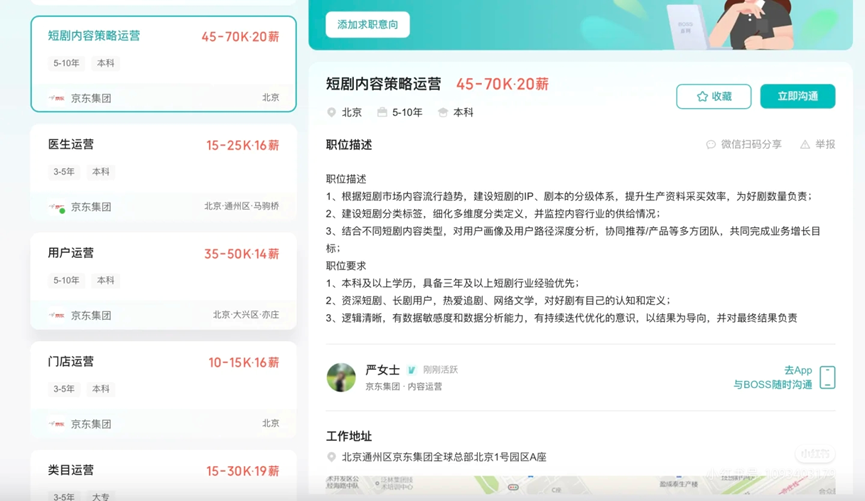 高薪之下,京东招聘标准不低。公开信息表明,京东要求应聘者本科及以上学历,有三年及以上短剧行业经验优先;要是资深短剧、长剧用户,热爱追剧和网络文学,对影视剧行业有深刻认知。