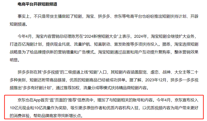 去年上半年,京东在App首页“逛”页面增加短剧内容,投入10亿现金和10亿流量,吸引优质作者和机构入驻。