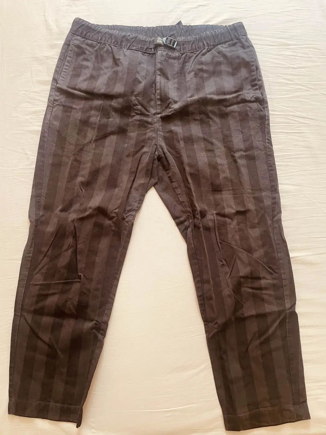 小陆根据AI的建议,找朋友借到的深咖色竖条纹裤子