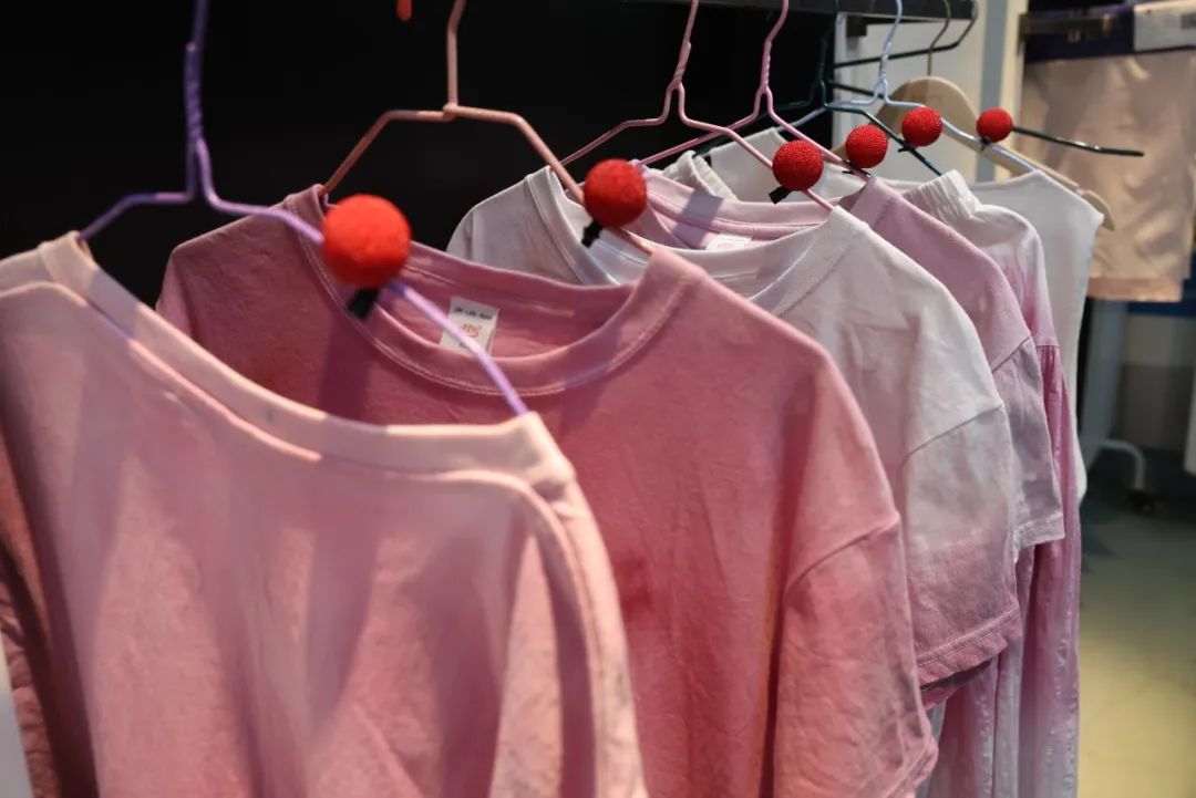 王若雯介绍说:“衣服采用杨梅扎染,图案模拟杨梅,呈现出一圈一圈的红色。”尽管工作室里没有高高的杨梅树,但“杨梅”元素却贯穿始终。这些设计均出自王若雯和她的团队之手。