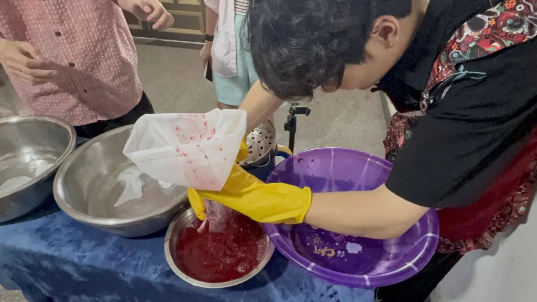 团队将五六斤杨梅倒进缸里,反复捣成杨梅泥,再加热制成染料。把衣服放进去染色、固色,然后拿到太阳下晒。果农们惊喜地说:“活了大半辈子,原来杨梅还能做衣服染料。”