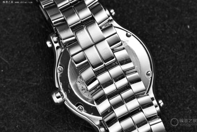 表壳采用精钢材质,经过抛光打磨处理,能呈现出细腻有质感的视觉效果。仔细看表冠处还镶嵌了一枚钻石,这枚腕表在细节方面相当精致。
