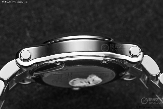 而且盘面镶嵌了三颗灵动的钻石,这也是happy sport系列的标志性设计。钻石与盘面进行了物理隔离,不会对盘面造成磨损,并且会随着手腕的摆动灵活滑动,为这枚腕表增添了很多趣味性。钻石是女士腕表常用元素,如何玩出花样是品牌需要不断研究的课题,happy sport系列的设计可以说是别具一格。