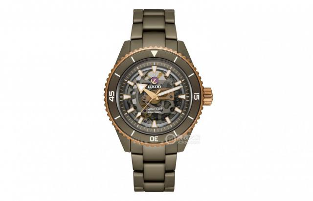 腕表点评:这款雷达库克船长系列 R32150162,可说是雷达品牌高科技陶瓷优势的集中体现。从表壳、表带到表圈衬片,整块表几乎都采用了该品牌引以为傲的高科技陶瓷,呈现出一种温润却不沉闷的光泽感。橄榄绿色的配色十分特别,搭配镂空表盘,视觉上极具吸引力。它的表径为 43 毫米,厚度 14.6 毫米,虽尺寸较大,但上手后并不特别重,这正是陶瓷材质的优势之一,比钢轻,又比普通塑料硬。而且整块表的防磁、防刮能力很强,日常佩戴无需小心翼翼。防水达 300 米,属于专业潜水表级别。内部搭载 R808 自动机械机芯,动力储备高达 80 小时,即摘下两三天不戴也不会停,还采用了 Nivachron ™防磁游丝,更加稳定抗干扰。搭配钛金属折叠扣,不易磨损也不易过敏。这款表很适合对“陶瓷 + 运动风”感兴趣的朋友。
