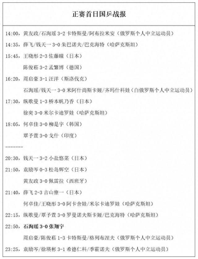 近期成绩不佳的国乒男双首轮也失利了,周启豪 / 陈俊菘1 - 3不敌卡特斯曼 / 格列布涅夫(俄罗斯个人中立运动员)。其余外战中国队保持全胜,详情如下: