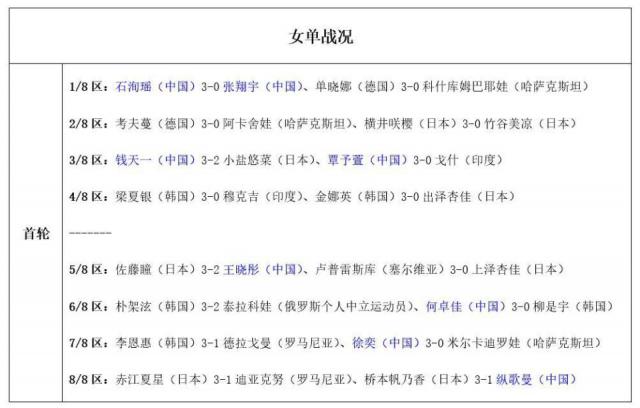 女单:覃予萱3 - 0戈什(印度)、何卓佳3 - 0柳是宇(韩国)、徐奕3 - 0米尔卡迪罗娃(哈萨克斯坦);