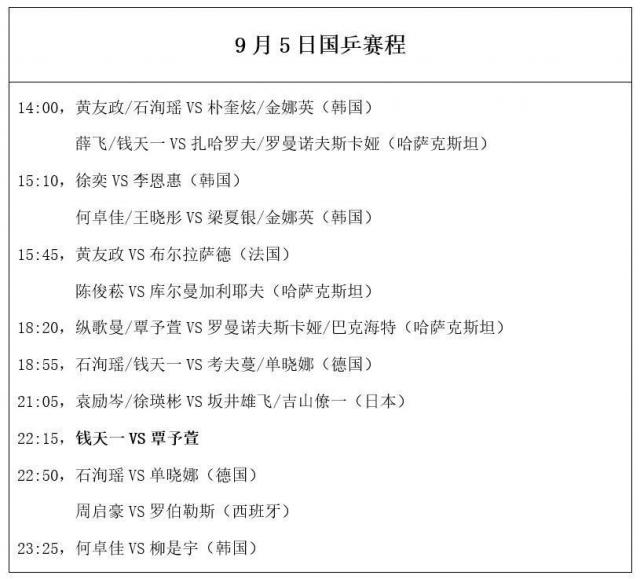 9月5日,国乒将迎来1场内战和12场外战,具体安排如下: