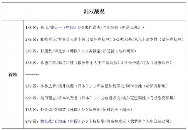混双:薛飞 / 钱天一3 - 0朱巴诺夫 / 巴克海特(哈萨克斯坦)、黄友政 / 石洵瑶3 - 2卡特斯曼 / 阿布拉米安(俄罗斯个人中立运动员)。