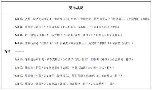 男单:黄友政3 - 0佩雷拉(西班牙)、陈俊菘3 - 2孟繁博(德国)、周启豪3 - 1汪洋(斯洛伐克);