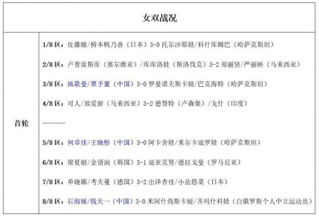 女双:纵歌曼 / 覃予萱3 - 0罗曼诺夫斯卡娅 / 巴克海特(哈萨克斯坦)、何卓佳 / 王晓彤3 - 0阿卡舍娃 / 米尔卡迪罗娃(哈萨克斯坦)、石洵瑶 / 钱天一3 - 0米阿什尚斯卡娅 / 齐玛什科娃(白俄罗斯个人中立运动员);