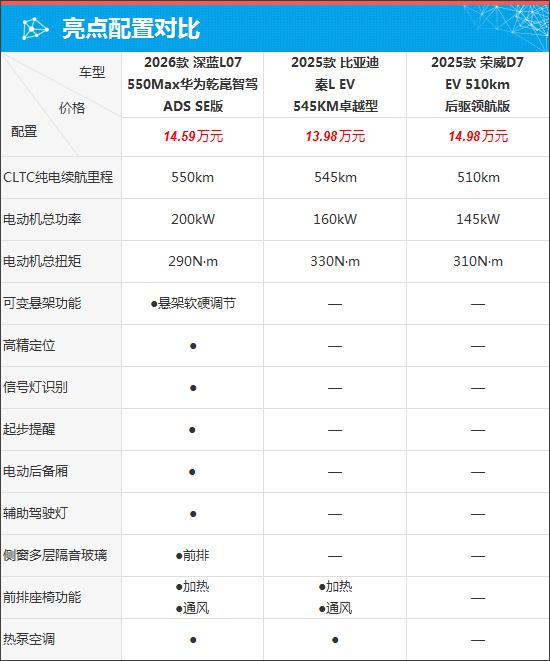 具体到车辆配置,深蓝L07整体表现更出色,智能化和舒适性体验更好,续航里程也有小幅优势。而荣威D7 EV虽价格最贵,但缺失配置较多,表现一般。