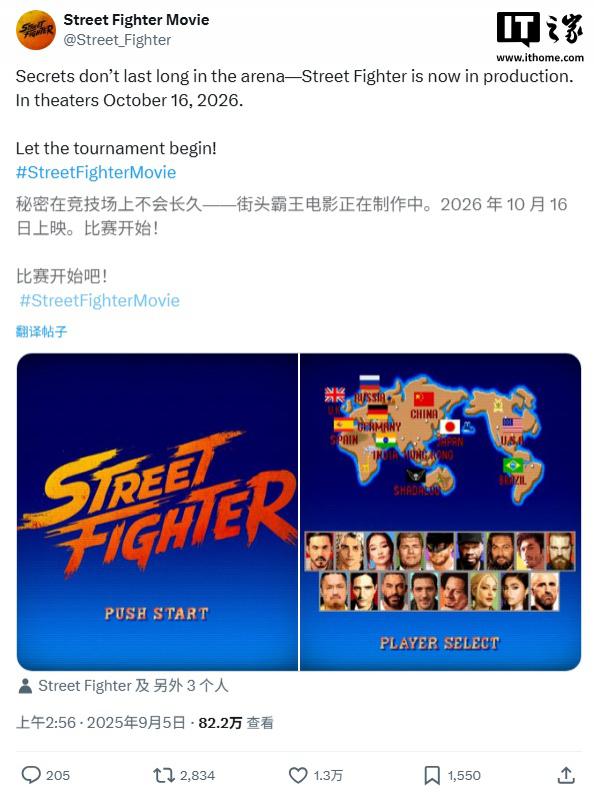 IT之家9月5日消息,自2023年公布以来,《街头霸王》电影今日宣布正在制作中,同时公布了完整演员阵容,并预告将于2026年10月16日上映(中国内地档期待定)。