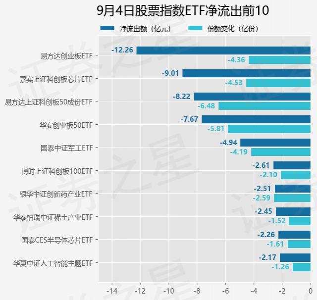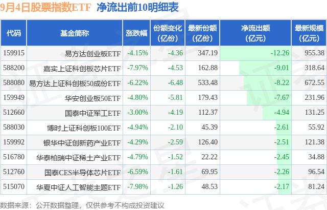 当日有312只股票指数ETF基金出现资金净流出,其中易方达创业板ETF(159915)净流出排首位,份额减少了4.36亿份,净流出额为12.26亿元。