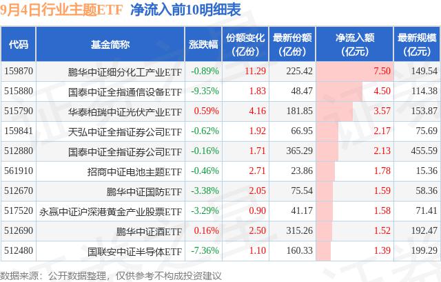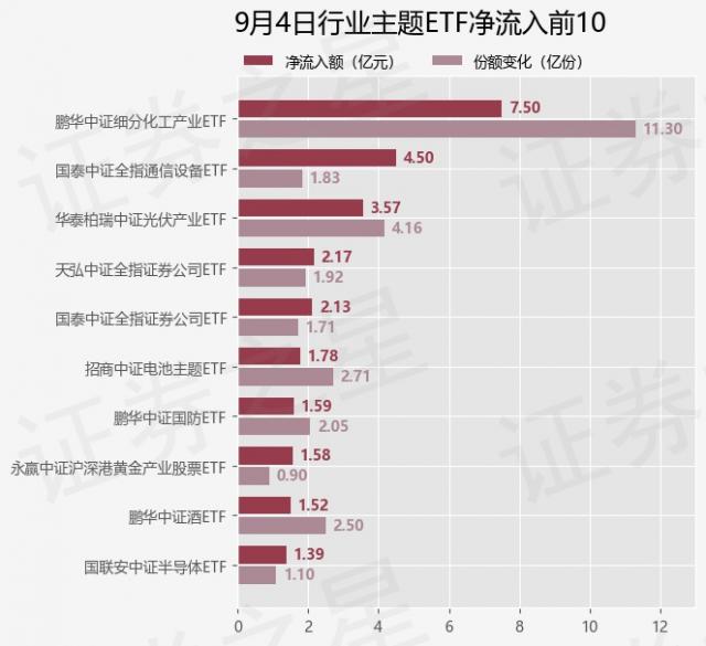 当日有94只行业主题ETF基金出现资金净流入,其中鹏华中证细分化工产业ETF(159870)净流入额居首,其份额增加了11.29亿份,净流入额达7.5亿元。