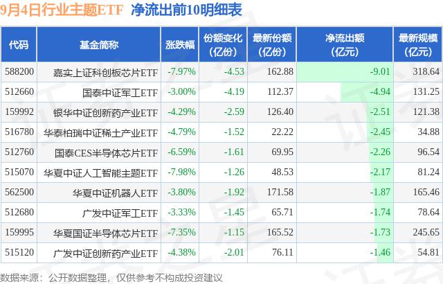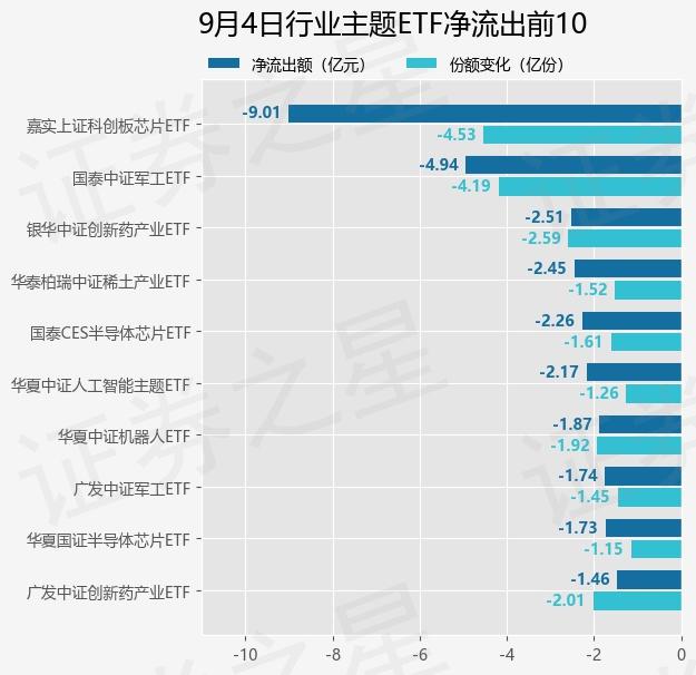 当日有177只行业主题ETF基金出现资金净流出,其中嘉实上证科创板芯片ETF(588200)净流出额最多,其份额减少了4.53亿份,净流出额为9.01亿元。