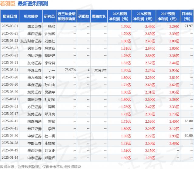 证券之星数据中心根据近三年研报数据计算,华源证券丁一研究员团队对该股研究深入,近三年预测准确度均值为78.97%,其预测2025年度归属净利润为盈利1.7亿,根据现价换算的预测PE为75.26。