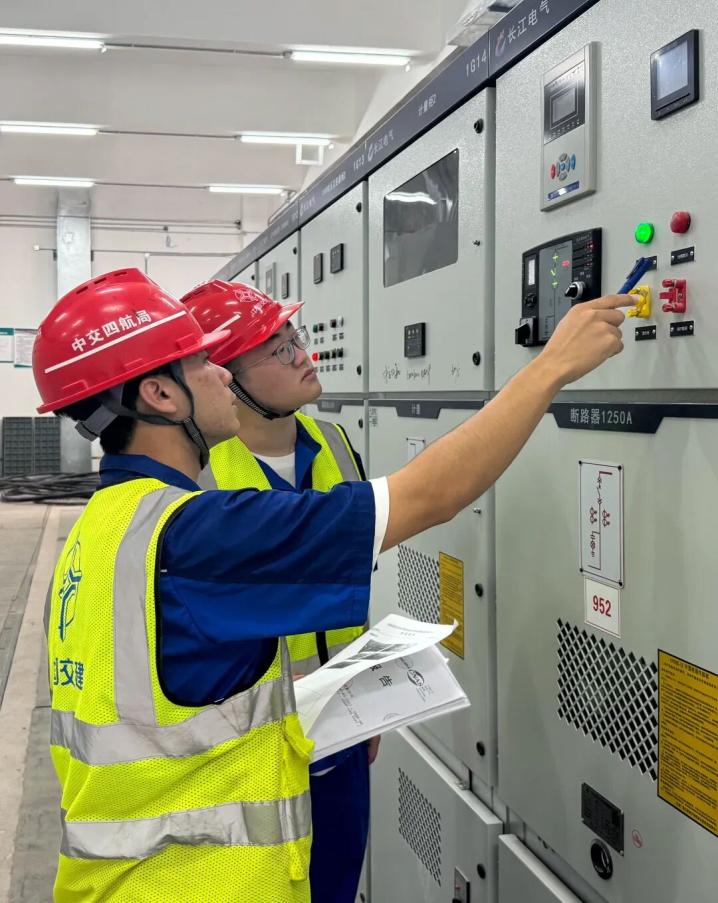 中交四航局航通公司重庆冷链项目员工陈泽宁和饶汝嘉在配电房高低压柜进行检修。 受访者供图
