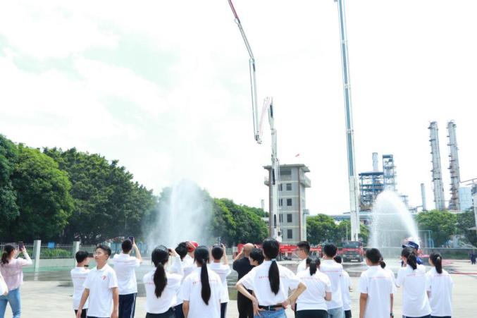 随后的出水展示环节让课堂气氛达到了高潮。随着指挥员一声令下,65米大跨度高喷车与灭火机器人依次出动,高喷炮头精准地切换直流、开花两种出水模式,引得现场阵阵欢呼。之后,师生们有序登上应急救援车,在广州石化队队员的指导下体验水枪出水操作,进一步加深了对应急救援工作的认识。