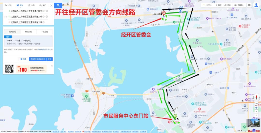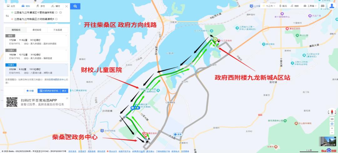 往返路线走向:祥和路东侧(九龙新城A区)——八里湖大道——柴桑路——渊明大道(柴桑区行政服务中心)。车辆停靠沿线公交站点。 详见下图: