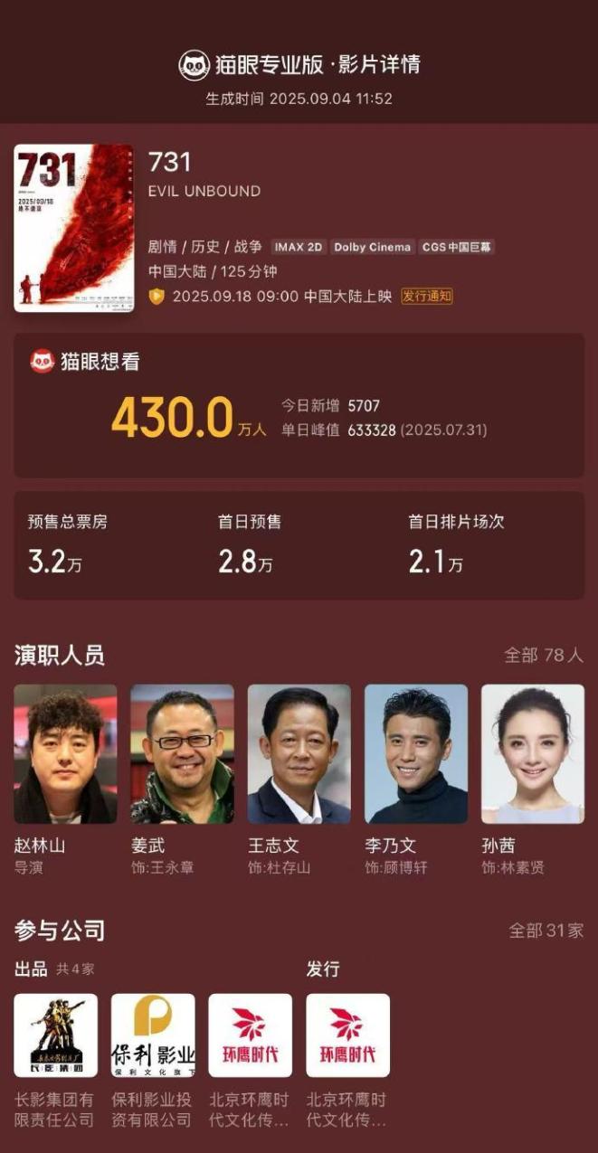 猫眼专业版数据表明,截至4日11时许,影片《731》累计想看人数已突破430万,暂列猫眼平台想看榜第二位,目前影片已开启预售。
