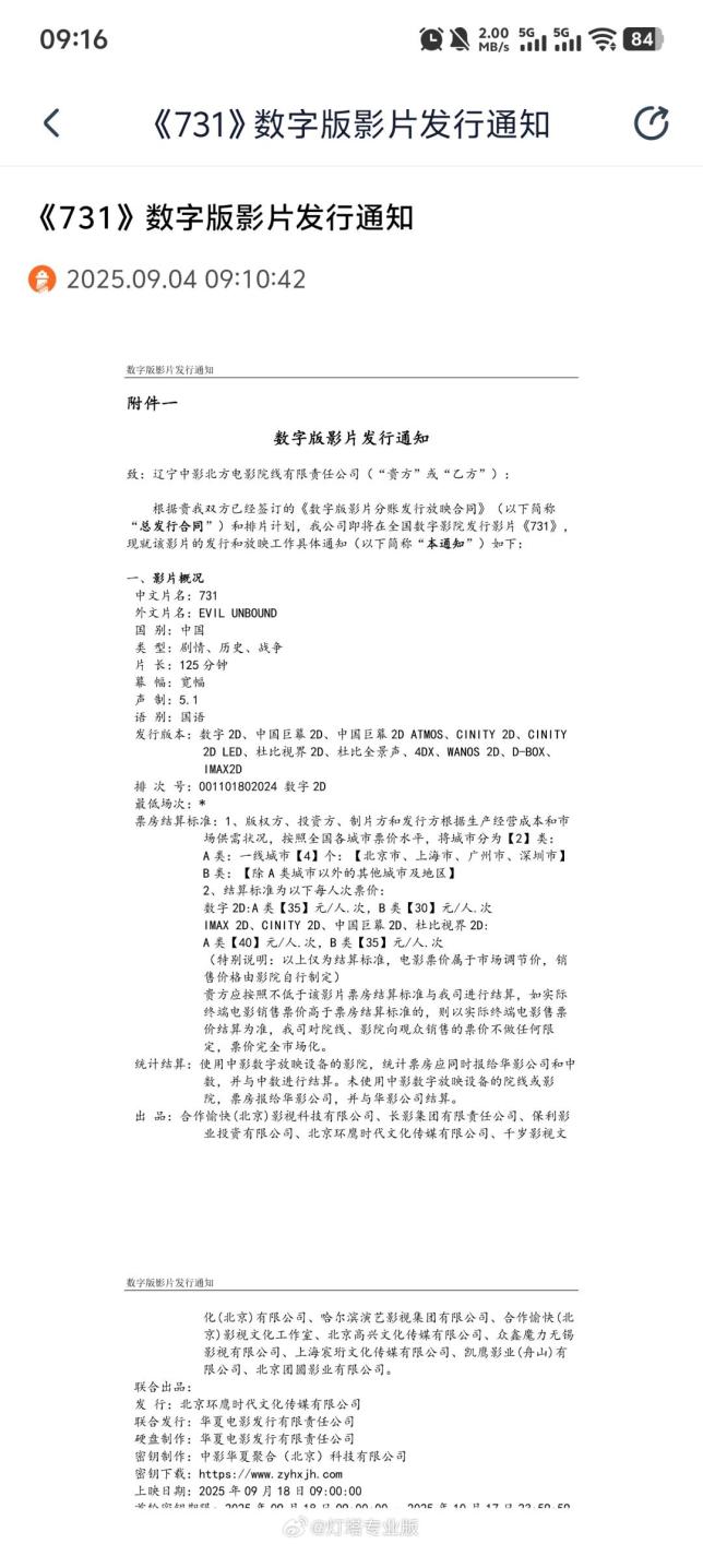 9月4日,灯塔专业版消息显示,影片《731》发行通知已出炉,该片片长125分钟,将于9月18日上映,发行版本有中国巨幕2D、CINITY2D。