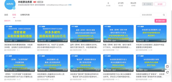 从整个行业来看,解包泄密事件并不少见。不过,二次元游戏公司对解包行为的打击力度显著高于其他类型游戏企业。米哈游法务部自今年三月在各大平台运营后,受到广泛关注,目前已发布了十条相关视频,光 B 站平台最高点击量视频达一百多万。
