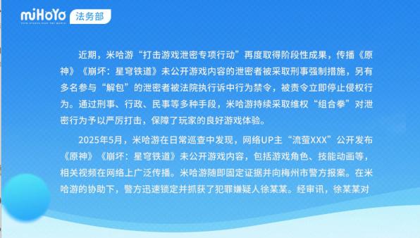 事件一:2025 年 5 月,网络 UP 主 “流萤 XXX” 发布了游戏内未公开的内容,包括游戏角色、技能动画等,相关视频在网络上广泛传播。米哈游固定证据后向警方报案,警方抓获了犯罪嫌疑人徐某某。徐某某对传播未公开游戏内容非法牟利的行为供认不讳,目前已被依法采取刑事强制措施。