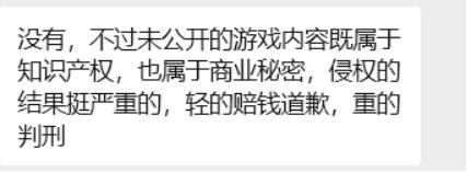 游戏价值论咨询了法律专业人士,他表示:未公开的游戏内容既属于知识产权,也属于商业秘密,侵权结果一般轻则赔钱道歉,重则判刑。