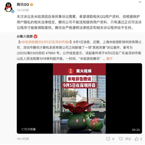 针对这一诉讼,腾讯在 9 月 1 日晚间转发相关微博并回应称:“此次诉讼,实际是米哈游出于自身民事诉讼的需求,希望调取相关 QQ 用户的资料。但依据保护用户隐私的相关法律规定,腾讯公司不能违规提供用户资料,只有通过正式的司法诉讼程序,才能进行调取和提供。腾讯会严格遵照法律规定以及相关诉讼程序提供支持。”
