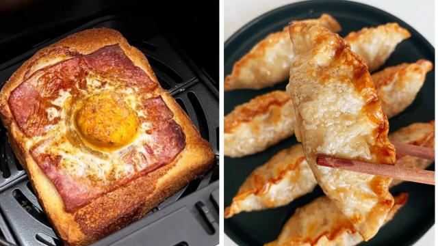 ③ 空气炸锅:这是最勤快的厨房小家电,基本啥都能做,像太阳蛋吐司、小披萨、培根鸡蛋杯等。中式早餐也能用它做出花样,比如饺子刷点油(无油也能炸),不用预热,丢进去烤,洗个脸刷个牙的时间,煎饺就做好了,鲜香酥脆的早餐也不难。