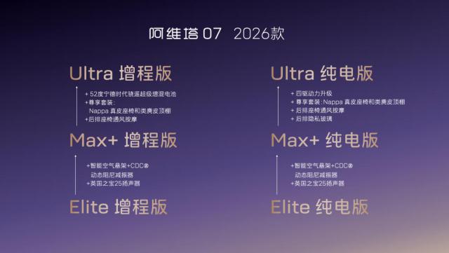 最新开启预售的阿维塔 07 2026 款,在 6 款配置车型中,Elite 版从入门开始就是满配。而且增程版全系都可以选择 52 度大电池,在预售期间下定的用户还能享受 2000 元抵 5000 元购车款的优惠。