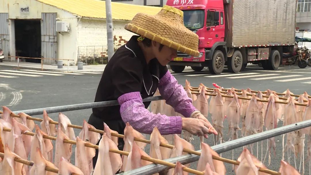 鱼干加工厂工人 关阿姨:有门鳝、肉鳝、“放风飞”等各种鱼,销往东平、阳江江城、阳西、广州、深圳等各地,开渔后渔货多。