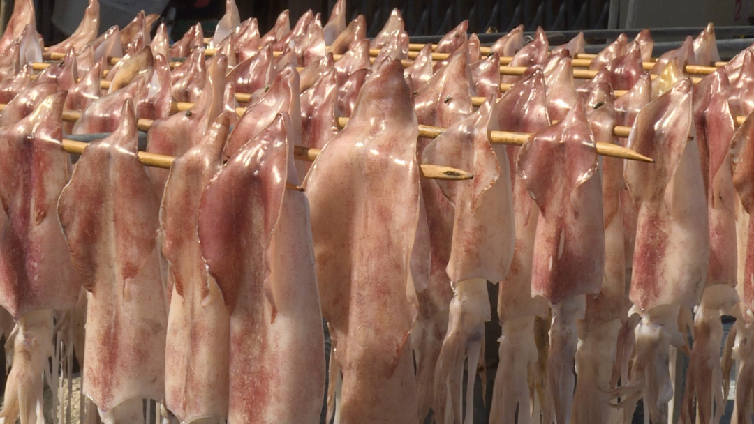 充足的阳光洒在闸坡晒鱼场上,一排排晾晒架上挂满了各种各样的鱼干,在阳光下闪耀着金黄色的光泽。鱿鱼、鳝鱼、龙利鱼等渔货让人目不暇接,空气中弥漫着醇厚的鱼干鲜香。记者在现场看到,工人们各司其职:有的忙着把晒好的鱼干按大小分类整理,准备封装;有的则在清洗、处理刚送来的新鲜鱿鱼和章鱼,为后续晾晒做准备。据加工场的工人介绍,开渔后渔获丰富,他们每天能晾晒各类鱼干一两百斤。