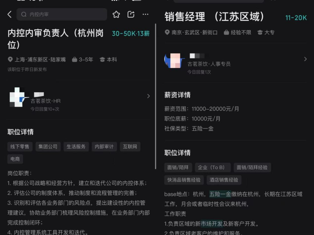 当时,古茗在上海、南京两地招募相关团队。上海招聘的岗位是内控内审负责人,主要在杭州办公;南京招聘的岗位为销售经理、拓展顾问,主要在江苏区域办公。
