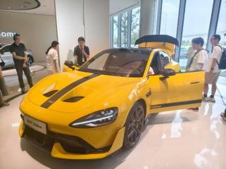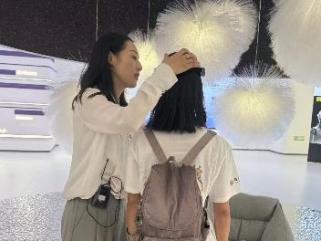 师生在小米汽车超级工厂展厅内合影留念