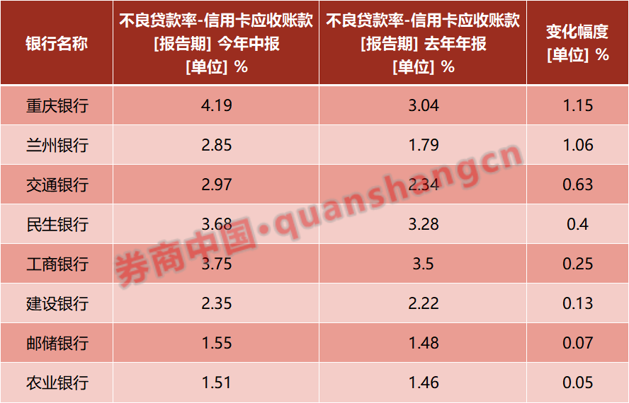 其中,6月末,重庆银行信用卡不良率较年初增加1.15个百分点至4.19%;兰州银行信用卡不良率较年初增加1.06个百分点至2.85%,增幅均超1个百分点。交通银行、民生银行、工商银行的信用卡不良率分别较年初增加0.63、0.4、0.25个百分点,至2.97%、3.68%、3.75%。