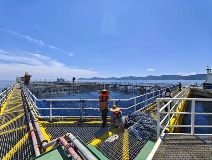 台风“塔巴”将至,工作人员对“台山1号”养殖平台开展防护工作。