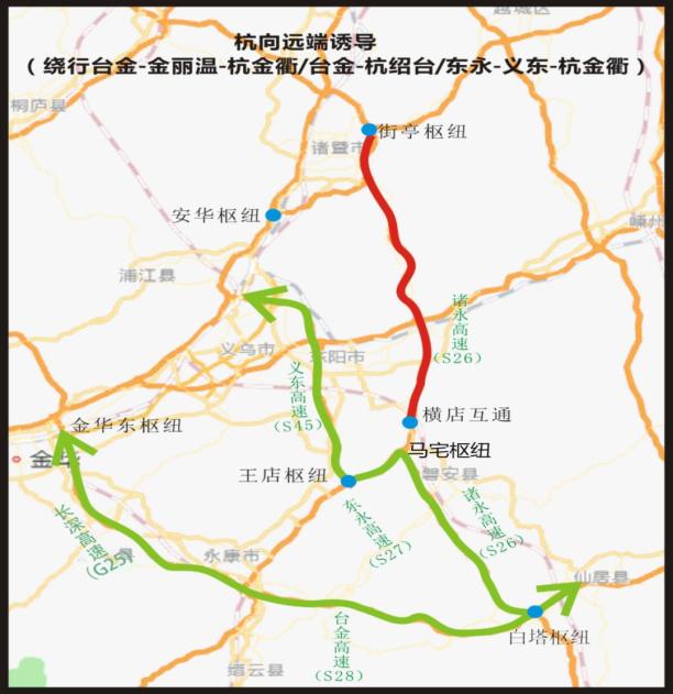 杭州方向车辆绕行路线①:白塔枢纽→S28台金高速→前仓枢纽→G25金丽温高速→金华东枢纽→G60杭金衢高速行驶。