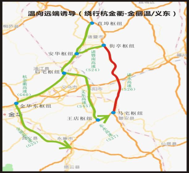 温州方向车辆绕行路线②:G60杭金衢高速金华方向→后宅枢纽→S45义东高速→王店枢纽→S27东永高速行驶。