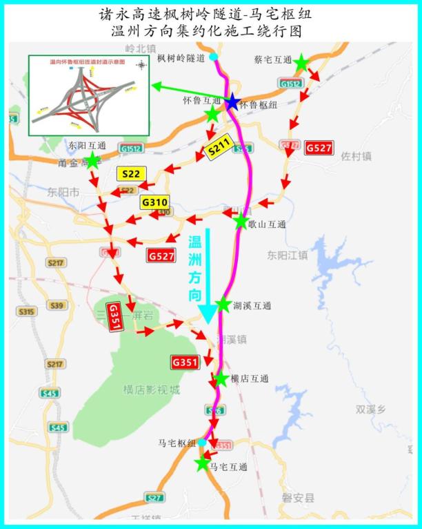 因S26诸永高速公路金华段(马宅枢纽 - 枫树岭隧道段)需进行集约化施工(遇恶劣天气及其它特殊情况顺延),施工期间具体交通管制情况如下: