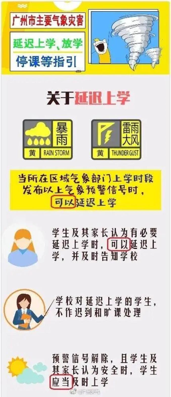 根据《广州市公众应对主要气象灾害指引》和《广州市教育系统应对台风、暴雨灾害天气指引》,未启程上学的学生:①当所在区域发布台风黄色预警信号后,中等职业学校、中小学校、特殊教育学校、幼儿园、托儿所应当停课;②发布暴雨黄色、雷雨大风黄色预警信号时,可以延迟上学。