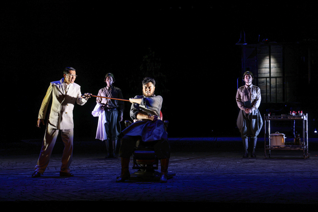 首演剧照 周帅(以手杖戳人者)饰演盖世太保拉姆博士,他也是该剧的副导演;金汉(坐者)饰演伯克勒