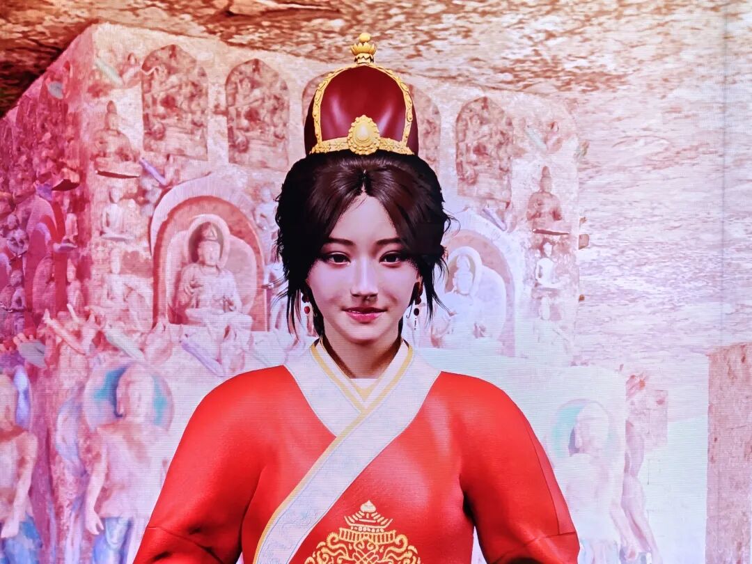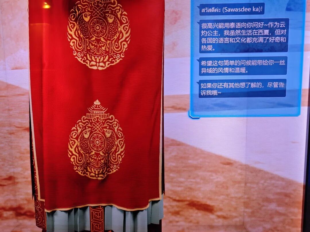 参观期间,景区的数字IP推荐官“云灼公主”给泰国游客带来了巨大的惊喜。当“云灼公主”用标准的“萨瓦迪卡”向泰国游客问好时,现场气氛瞬间热烈起来。泰国游客们积极与“云灼公主”互动交流,仿佛穿越时空,与西夏公主进行了一场跨越千年的对话。
