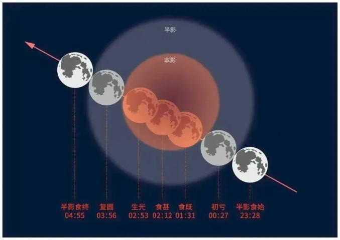 月全食从半影食始开始到半影食终结束,共七个阶段。本次月全食各阶段时间点和见食情况示意图。来源:《天文爱好者》杂志