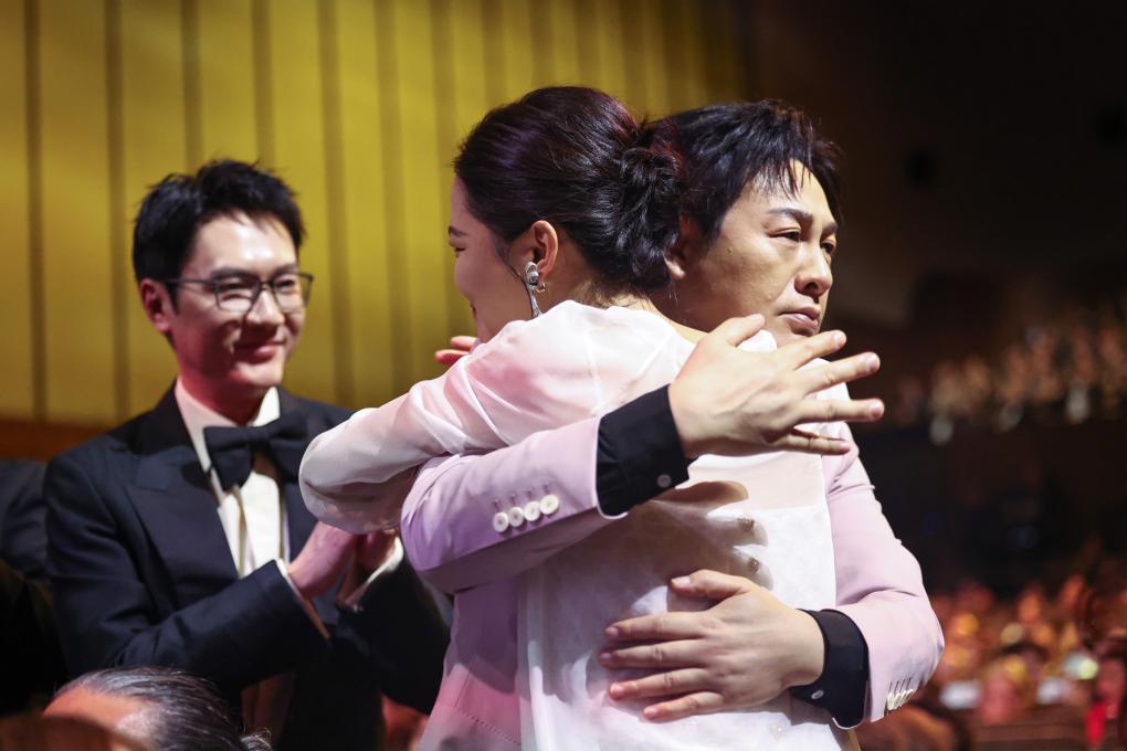 9月6日,在意大利威尼斯,辛芷蕾(右)荣获第82届威尼斯电影节最佳女演员奖后接受电影《日挂中天》演员张颂文和冯绍峰祝贺。新华社记者 李京 摄